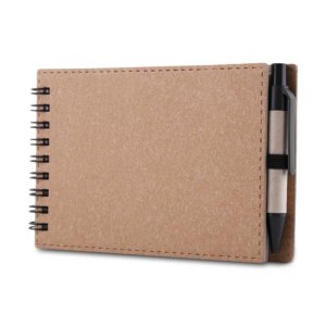 REF: ABL048Mini Caderno com capa em papelão e encadernação espiral wire-o, folhas sem pauta em 70g/m². Acompanha mini caneta confeccionada em papelão reciclado com detalhe em plástico.