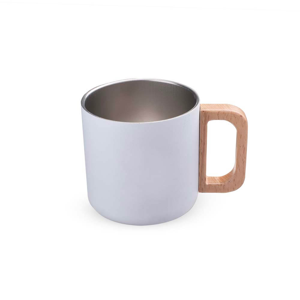 Caneca térmica com capacidade de 400ml, parede dupla em aço inox (304 interno / 201 externo), alça em madeira. Embalagem caixa branca.