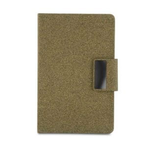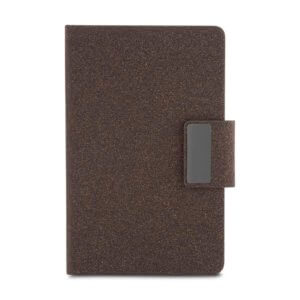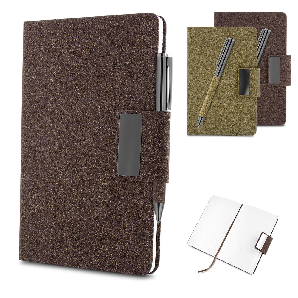 REF: ACAD445Kit de Escritório composto por caderno tamanho A5, com capa em PU e detalhe em fibra de chá ou café, contendo 80 folhas pautadas de 70g/m². Acompanha caneta metálica com acabamento no mesmo material de fibra, formando um conjunto elegante e sofisticado. O kit acompanha estojo de papelão na cor preta.