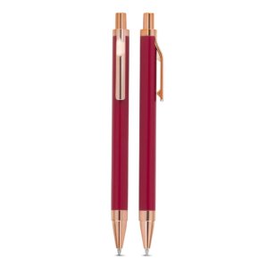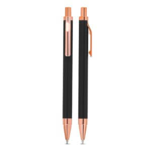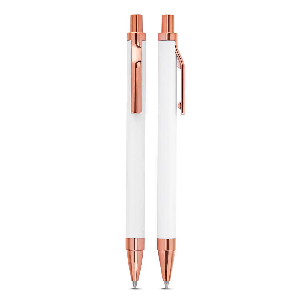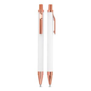 REF: ACM0220Caneta esferográfica com corpo em alumínio reciclado, acionador e clipe em acabamento rosé/bronze.