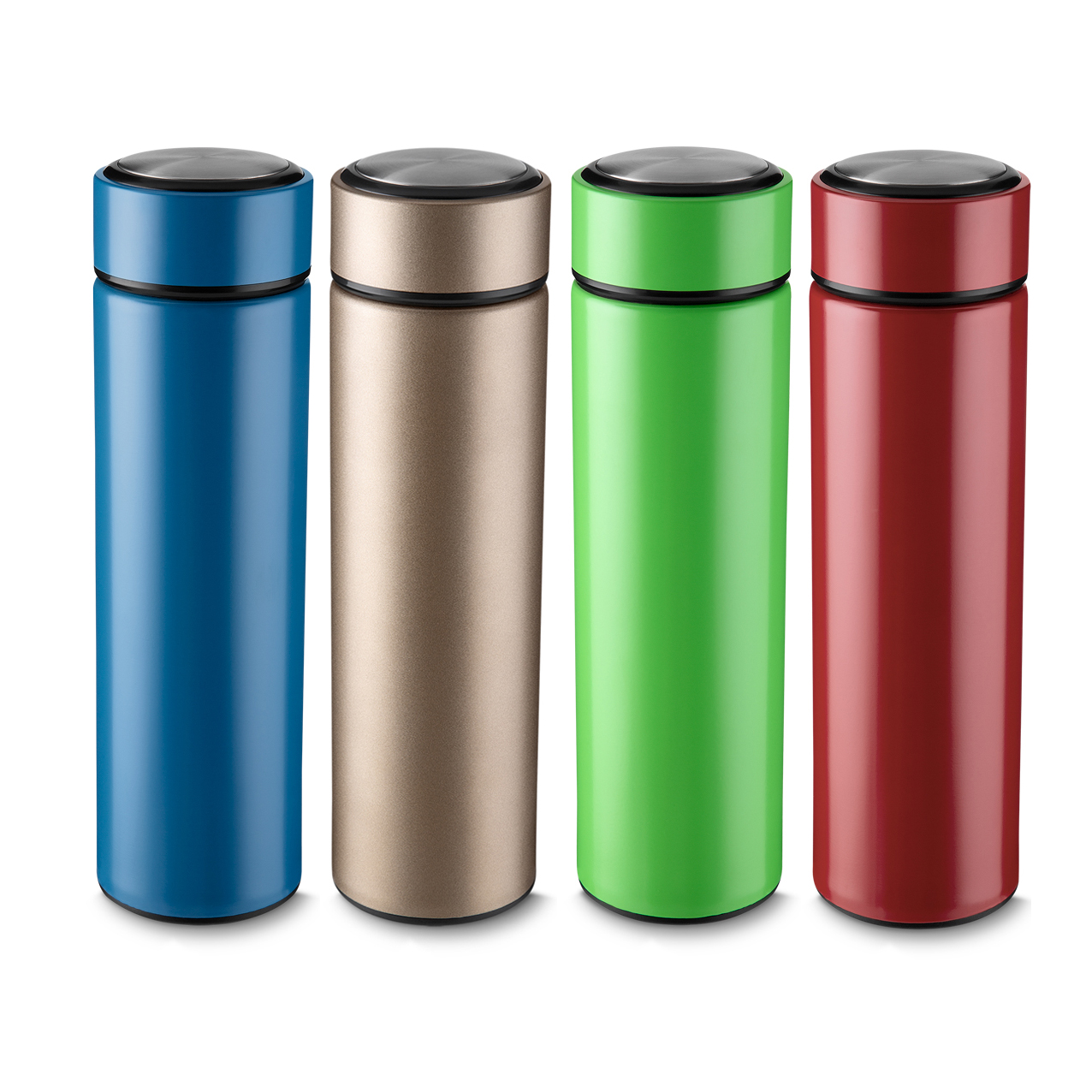 REF: AGA6750Garrafa térmica em aço inox com parede dupla isolada a vácuo, com capacidade de até 450ml, com infusor. Tampa rosqueável com anel de silicone para vedação. Conserva líquido quente por até 12 horas e líquido frio até 18 horas