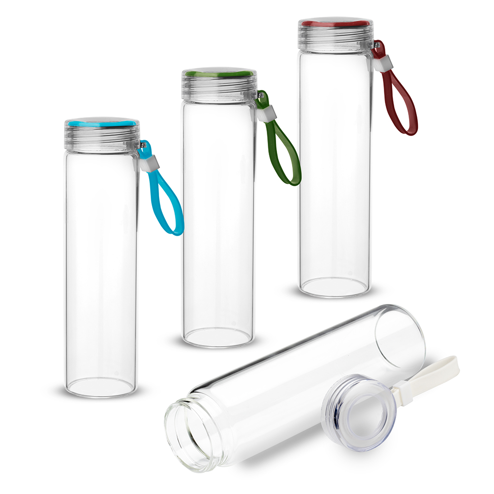 Garrafa em vidro borossilicato com alça em silicone e tampa rosqueável, com capacidade de até 500ml.