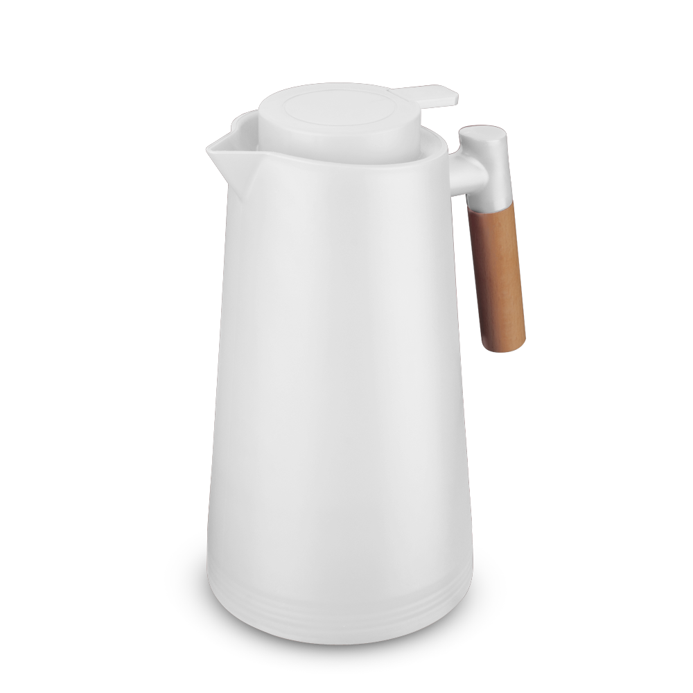 REF: AGT200Garrafa Térmica de Plástico PP (exterior) com parede dupla de ampola de vidro (interior), com capacidade de até 1L. Alça de transporte lateral em madeira. Tampa rosqueável em plástico com anel de silicone para vedação. Conta com um sistema corta-pingo.