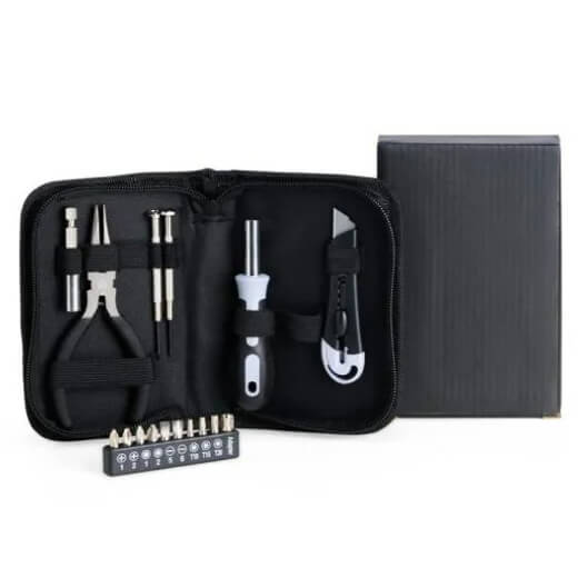 REF: FE00951Conjunto de ferramentas. Conta com alicate de bico; chave com dez peças de ponteiras + extensor, sendo quatro phillips, duas fendas, três torx e adaptador; duas chaves de precisão, sendo uma phillips e uma fenda; estilete 1,85″ e estojo em nylon 15,5 x 10cm com fechamento em zíper. Embalado em caixa preta cartonada (resistente) 16,2 x 10,6 x 4,2cm. NCM 82055900.