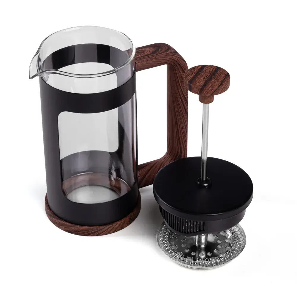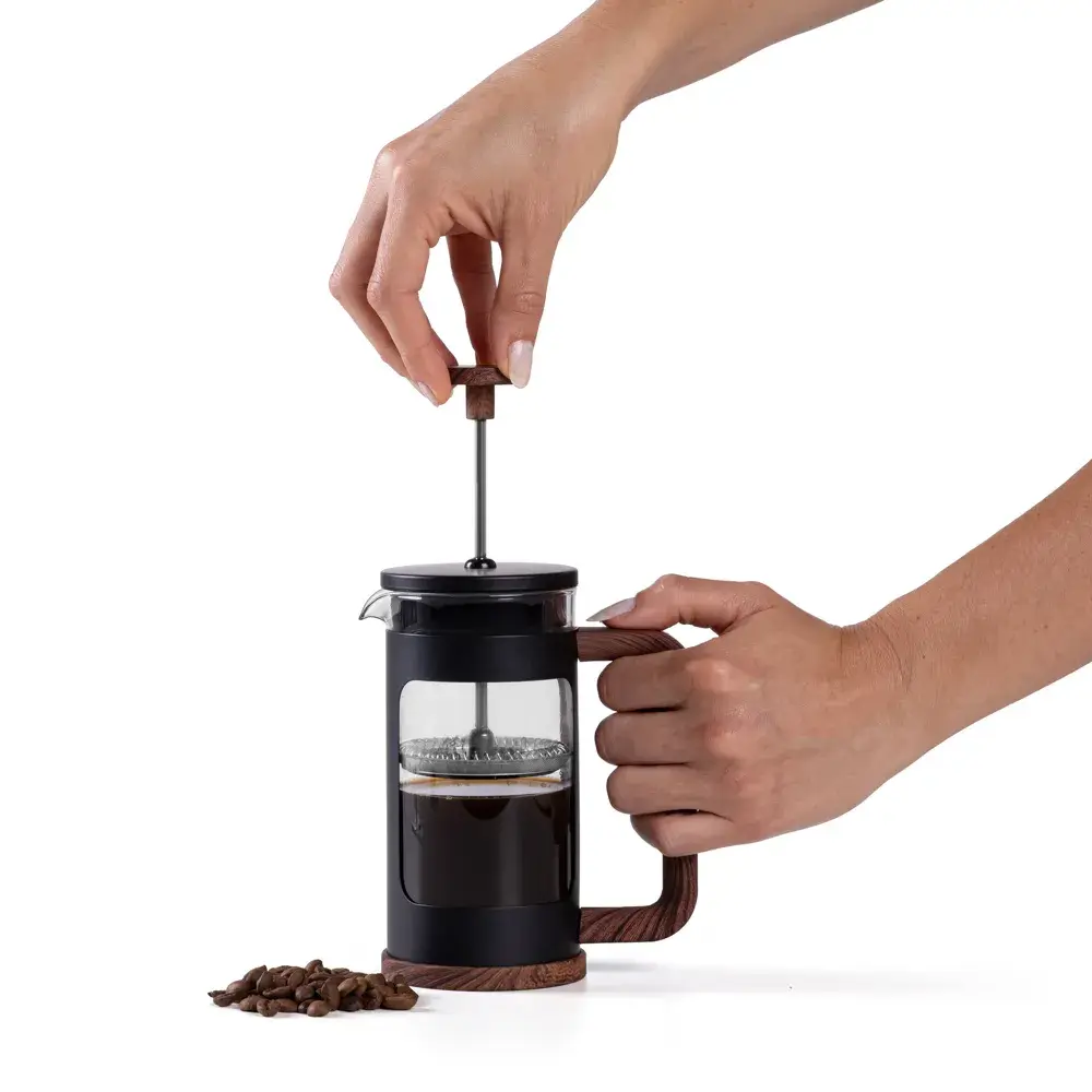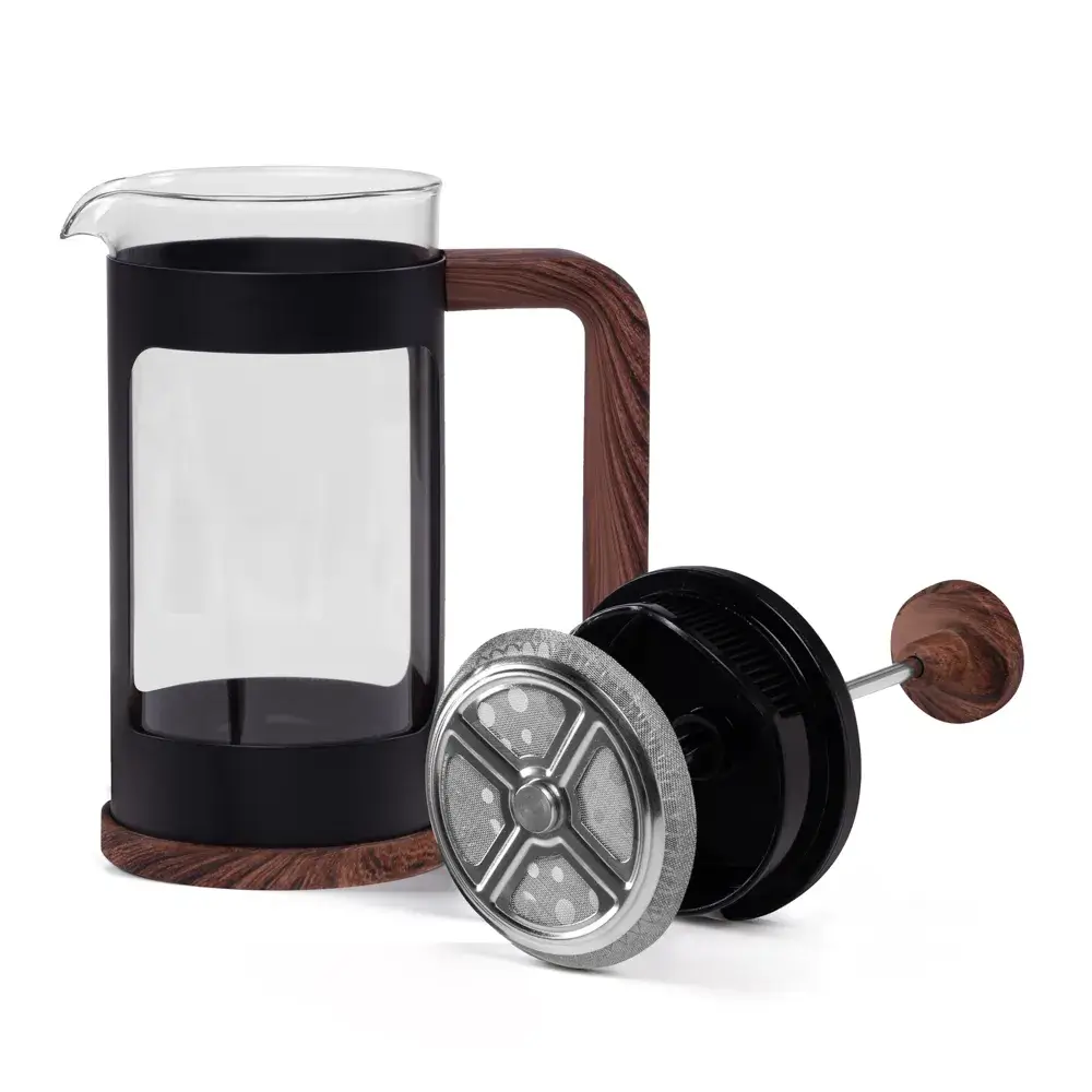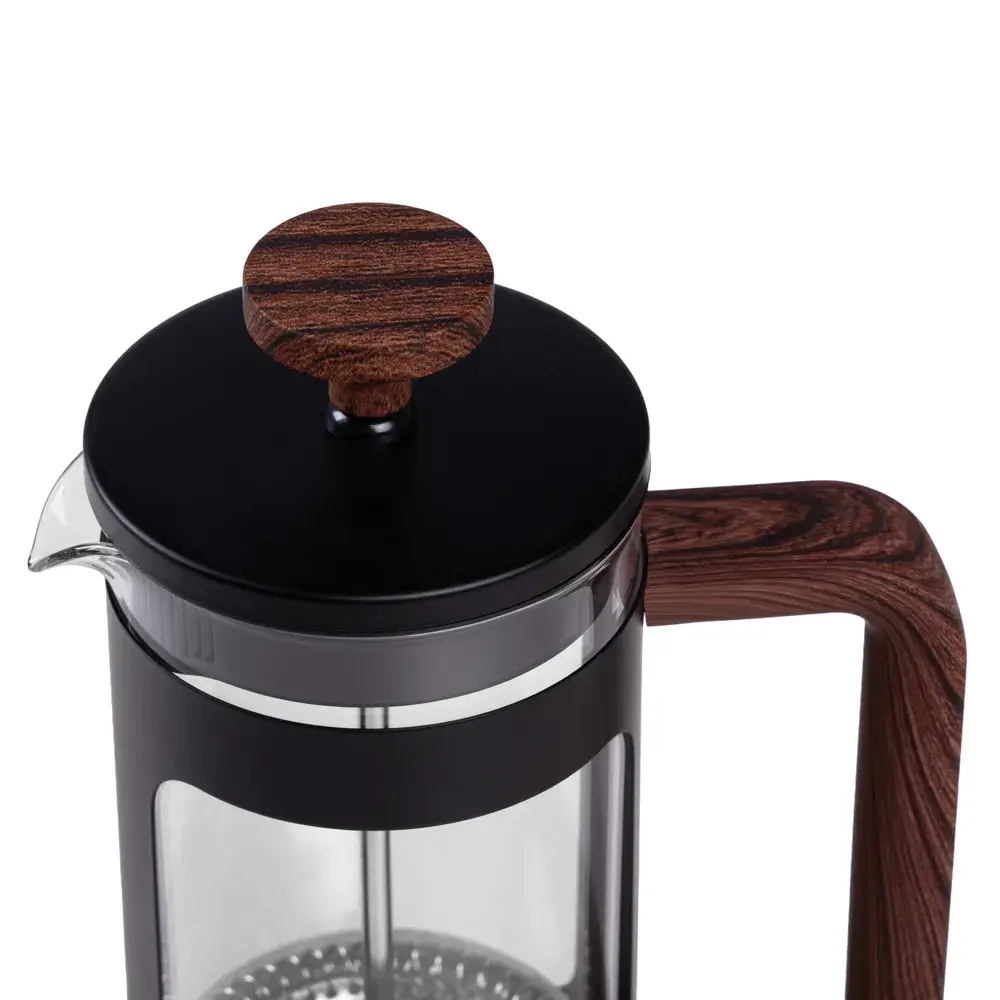 REF: IG00428Cafeteira prensa francesa em Vidro Borosilicato / Metal com detalhes amadeirados com capacidade de 350ml. Também pode ser usado para o preparo de chás. Não necessita de filtro para o preparo do seu café/chá. Dimensões: 17,3 x 12,5 x 7,4cm.