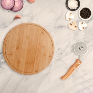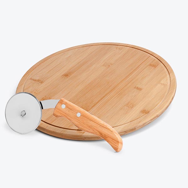 REF: PD11123Conjunto para Pizza em Bambu/Aço Inox Napoli – 2 pçs. Acompanha tábua em Bambu e cortador de Pizza em Bambu/Inox. Tábua confeccionada com tripla camada invertida, para dar maior durabilidade e não deformar com o passar do tempo. Rebites em Aço Inox 304, um dos mais resistentes à ferrugem e corrosão.