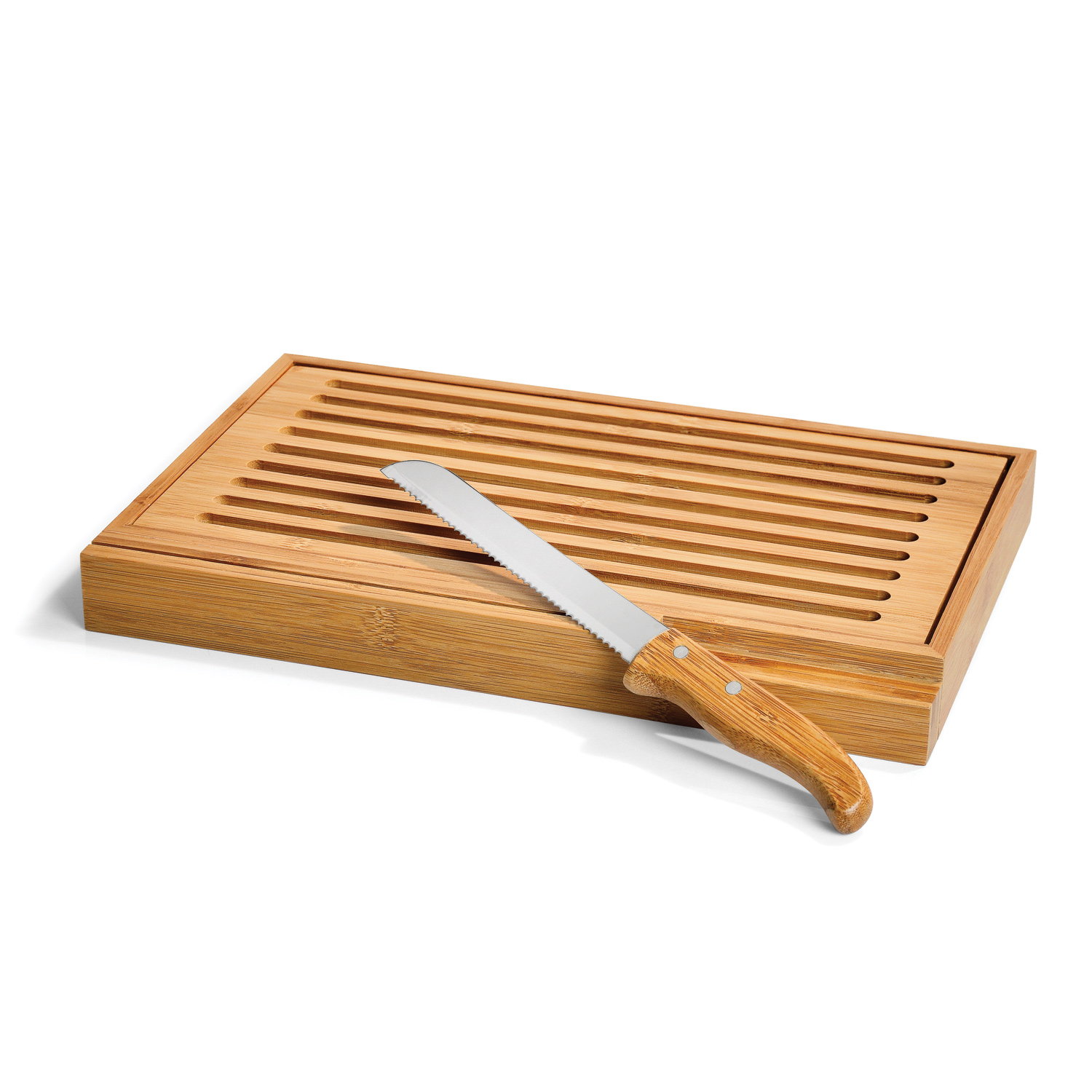 REF: PD00743Migalheira em Bambu com faca 7″ para pão em cabo de bambu e lâmina em aço inox com rebites resistentes à ferrugem e corrosão. Embalagem plástica dimensões: 39,5 x 24,5 x 4cm. NCM: 4419.19.00