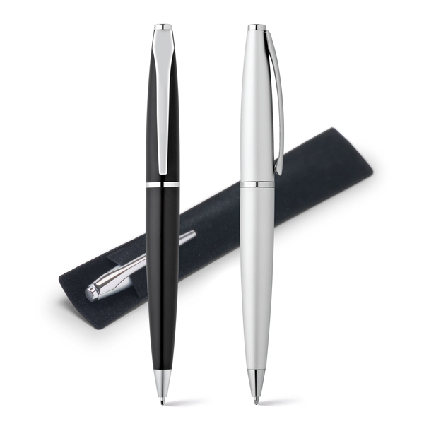 REF: S91814Caneta esferográfica em metal DELI com 1,5km de escrita tinta azul. Dimensões: 1,2cm diâmetro x 13,5cm de comprimento. Incluso embalagem de veludo.