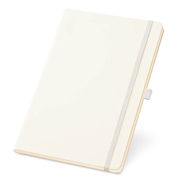 REF: S93728– Caderneta capa dura A5. Medidas: 13,7 x 21cm. Possui porta esferográfica, bolso interior e 80 folhas pautadas na cor marfim.