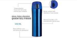 REF: X02087Garrafa térmica 450ml colorida com sistema de trava, ideal para líquidos quentes ou frios. Material metálico com revestimento interno em inox, parte inferior com borracha anti deslizante; possui tampa plástica fosca com borracha interna para vedação evitando o vazamento de líquido e prezando sua temperatura; possui botão central para abertura e trava lateral (basta seguir a orientação dos desenhos de cadeados simulando o travamento / destravamento da tampa).