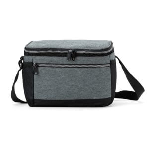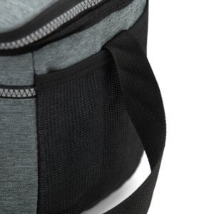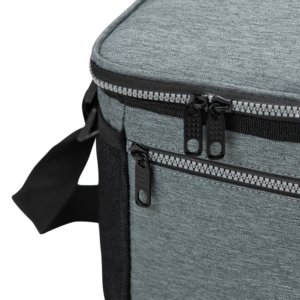 REF: X04628Bolsa térmica 10 litros com bolsos externos, contém bolso frontal com zíper, bolsos laterais telados e alça transversal regulável com apoio para ombro.