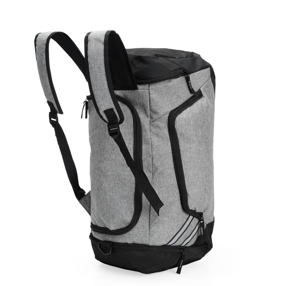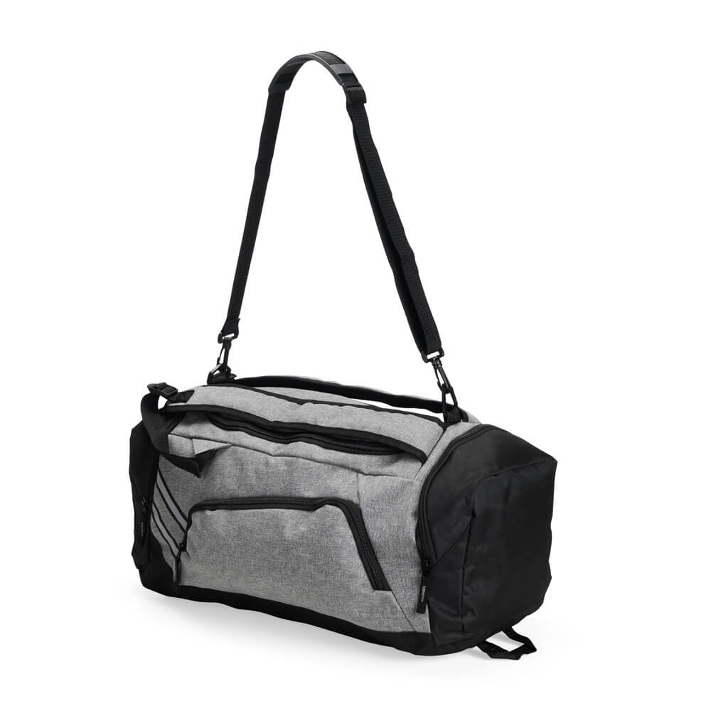 REF: X05329Bolsa de viagem confeccionada em poliéster resistente à água e capacidade para até 32 litros. Possui alças ajustáveis e acolchoadas para as costas, o que permite seu uso também como mochila. Além do compartimento interno principal, conta com três bolsos externos, incluindo um dedicado para tênis. Acompanha alça transversal removível.