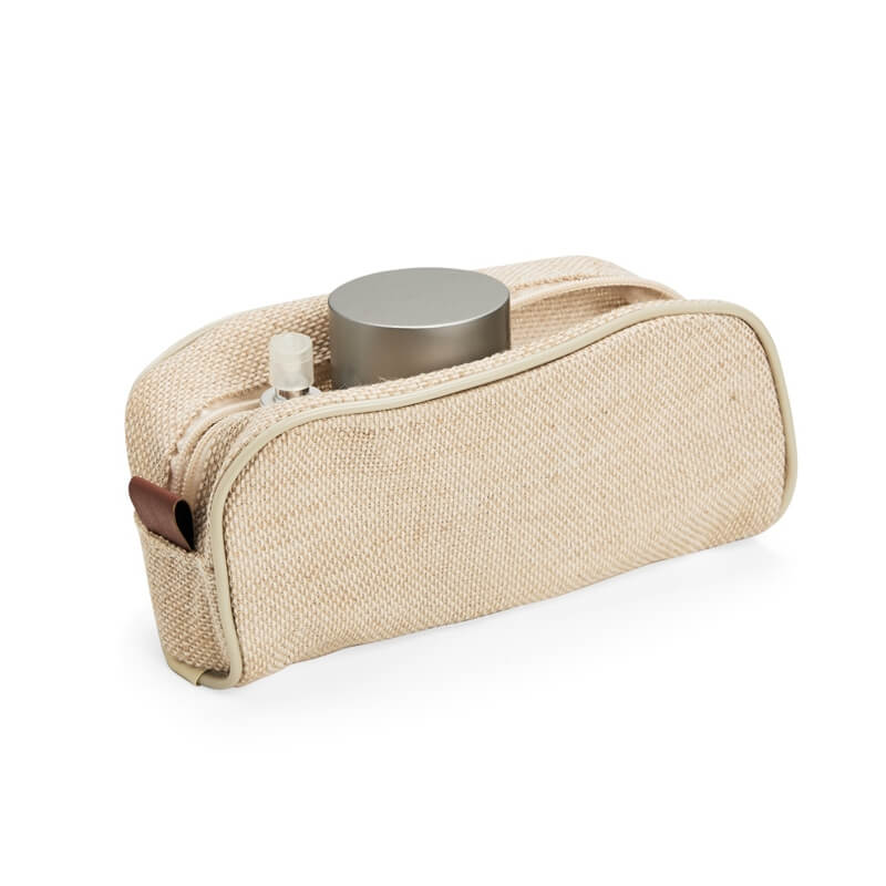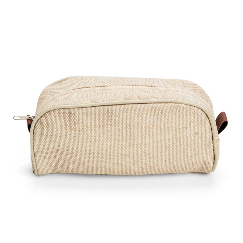 Nécessaire confeccionada em juta resistente à água, detalhes em bidim, acabamento em plástico e fechamento em zíper.